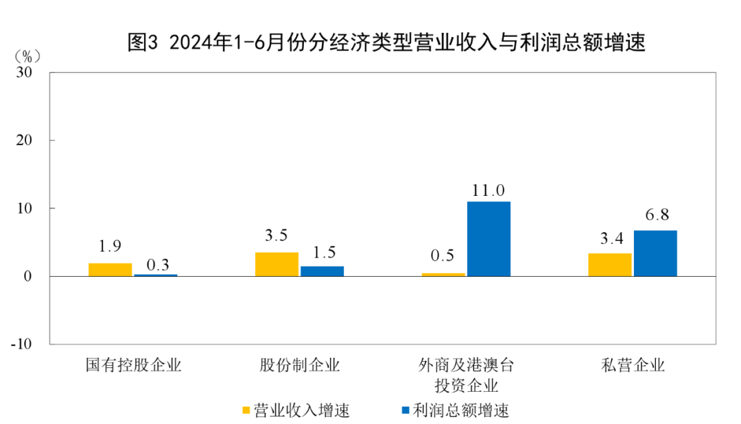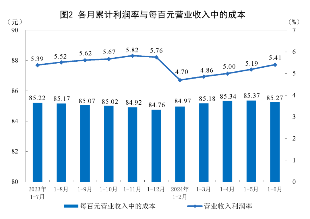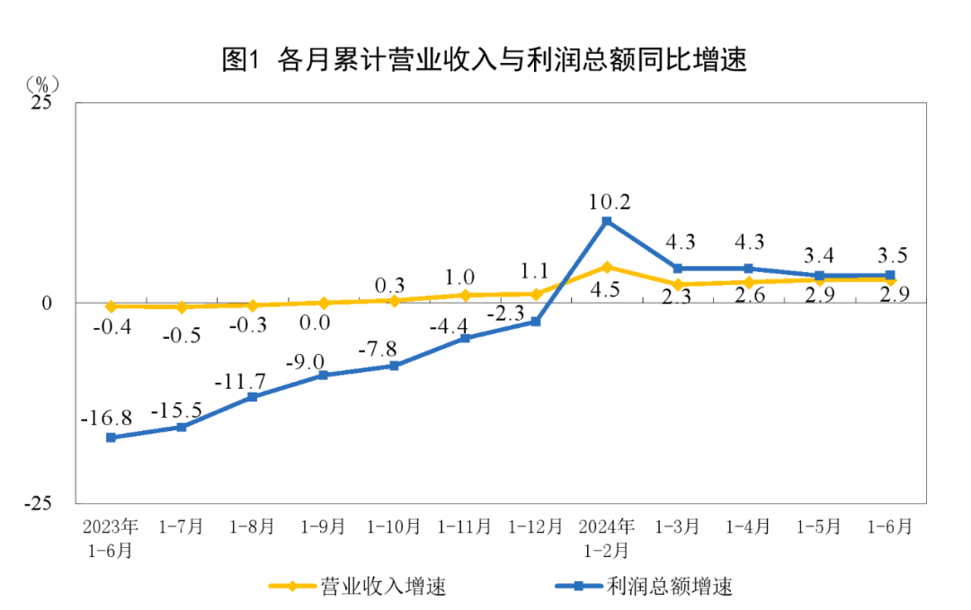 上半年,随着各项宏观政策落实落细,工业生产平稳较快增长,企业利润持续稳定恢复,工业企业效益状况呈现以下主要特点:工业企业利润增速有所加快。上半年,全国规模以上工业企业利润同比增长3.5%,增速比1—5月份加快0.1个百分点。其中,6月份规上工业企业利润增长3.6%,增速比5月份加快2.9个百分点。分行业看,在41个工业大类行业中,有32个行业上半年利润同比增长,增长面为78.0%,与1—5月份持平。工业企业营收稳定恢复。工业生产平稳较快增长,叠加二季度以来工业品出厂价格降幅明显收窄,共同推动企业营收稳定恢复。上半年,规上工业企业营业收入同比增长2.9%,与1—5月份持平。企业营收稳定恢复,为利润持续增长创造有利条件。装备制造业有力支撑工业利润增长。随着制造业高端化、智能化、绿色化步伐加快,装备制造业活力不断增强,有力支撑规上工业利润增长。上半年,装备制造业利润同比增长6.6%,拉动规上工业利润增长2.2个百分点,对规上工业利润增长的贡献率超六成。装备制造业利润占规上工业的比重为35.0%,同比上升1.0个百分点,今年以来比重持续上升,规上工业利润行业结构不断改善。分行业看,智能手机、集成电路、新能源汽车等高技术产品产销较快增长,带动电子、汽车行业利润分别增长24.0%、10.7%;造船业竞争力提升、订单快速增长,带动铁路船舶航空航天运输设备行业利润增长36.0%。消费品制造业利润持续快速增长。国内消费需求有所恢复,叠加工业品出口增长加快、上年同期基数较低等因素,共同推动消费品制造业利润较快增长。上半年,消费品制造业利润同比增长10.0%,延续年初以来的两位数增长态势,增速高于规上工业6.5个百分点。分行业看,在13个消费品制造大类行业中,有12个行业利润同比增长,其中8个行业增速超过10%。化纤、造纸行业利润分别增长1.28倍、1.05倍,文教工美、纺织、农副食品、印刷、酒饮料茶、食品制造行业利润增长10.1%—20.1%。采矿业、原材料制造业利润降幅明显收窄。上半年,上游行业效益持续恢复,采矿业、原材料制造业利润同比降幅比1—5月份分别收窄5.4个和6.6个百分点。分行业看,随着“迎峰度夏”和下游行业煤炭需求增加,煤炭行业利润降幅比1—5月份收窄7.0个百分点;受房地产新开工面积降幅收窄、大规模设备更新政策效果显现等因素推动,钢铁需求有所回升,二季度钢铁行业利润实现较快增长,扭转了钢铁行业一季度全行业净亏损的局面;有色冶炼行业受产品价格持续上涨等因素推动,上半年利润增长78.2%,保持高速增长态势。企业当月单位成本继续同比减少。6月份,规上工业企业每百元营业收入中的成本为84.80元,同比减少0.17元,连续两个月同比减少。从累计看,上半年规上工业企业每百元营业收入中的成本为85.27元,比1—5月份减少0.10元,今年以来,企业累计单位成本首次比上期减少。总体看,上半年规上工业企业效益平稳恢复,同时也要看到,国内有效需求不足制约企业效益持续改善,国际环境严峻复杂加大企业经营压力,工业企业效益恢复基础仍需巩固。下阶段,要坚决贯彻落实党的二十届三中全会精神,积极扩大国内需求,畅通国民经济循环,因地制宜发展新质生产力,塑造发展新动能新优势,不断推动工业经济高质量发展。