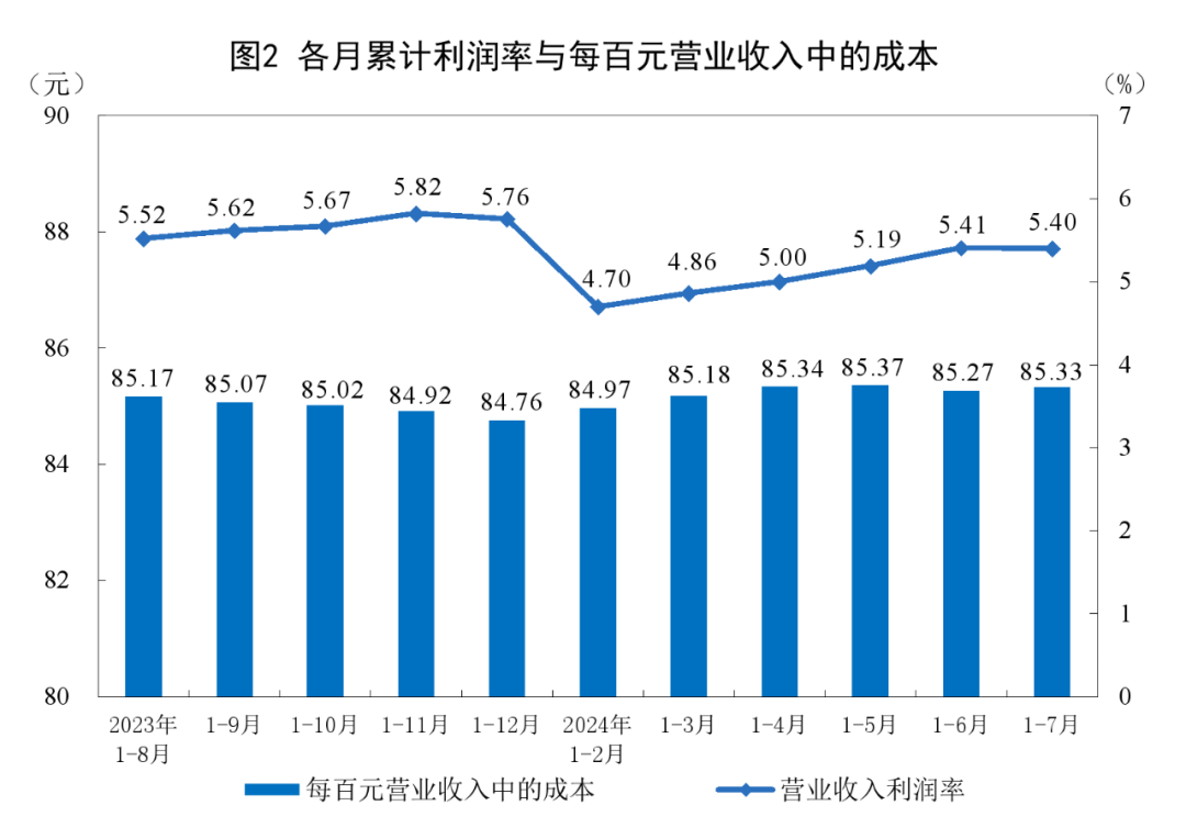1—7月份,规模以上工业企业中,国有控股企业实现利润总额13917.3亿元,同比增长1.0%;股份制企业实现利润总额30514.6亿元,增长1.9%;外商及港澳台投资企业实现利润总额10184.9亿元,增长9.9%;私营企业实现利润总额11031.0亿元,增长7.3%。1—7月份,采矿业实现利润总额7179.2亿元,同比下降9.5%;制造业实现利润总额29045.4亿元,增长5.0%;电力、热力、燃气及水生产和供应业实现利润总额4767.1亿元,增长20.1%。1—7月份,主要行业利润情况如下:有色金属冶炼和压延加工业利润同比增长79.3%,计算机、通信和其他电子设备制造业增长25.1%,农副食品加工业增长23.9%,电力、热力生产和供应业增长23.2%,纺织业增长18.4%,汽车制造业增长6.7%,石油和天然气开采业增长5.3%,化学原料和化学制品制造业增长4.8%,通用设备制造业增长4.3%,专用设备制造业下降2.9%,电气机械和器材制造业下降8.1%,煤炭开采和洗选业下降21.7%,非金属矿物制品业下降48.8%,石油煤炭及其他燃料加工业、黑色金属冶炼和压延加工业同比由盈转亏。1—7月份,规模以上工业企业实现营业收入75.93万亿元,同比增长2.9%;发生营业成本64.79万亿元,增长3.0%;营业收入利润率为5.40%,同比提高0.04个百分点。7月末,规模以上工业企业资产总计172.76万亿元,同比增长5.3%;负债合计99.51万亿元,增长5.1%;所有者权益合计73.25万亿元,增长5.7%;资产负债率为57.6%,同比下降0.1个百分点。7月末,规模以上工业企业应收账款25.10万亿元,同比增长8.1%;产成品存货6.47万亿元,增长5.2%。1—7月份,规模以上工业企业每百元营业收入中的成本为85.33元,同比增加0.09元;每百元营业收入中的费用为8.41元,同比持平。7月末,规模以上工业企业每百元资产实现的营业收入为76.4元,同比减少2.3元;人均营业收入为179.4万元,同比增加7.8万元;产成品存货周转天数为20.4天,同比增加0.2天;应收账款平均回收期为66.5天,同比增加3.4天。7月份,规模以上工业企业实现利润同比增长4.1%。