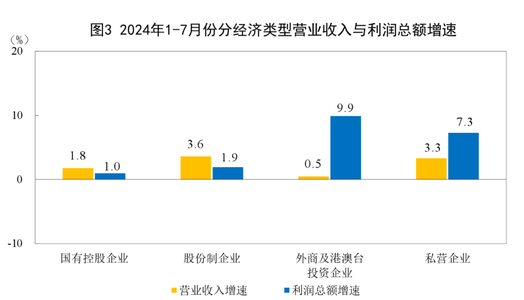 7月份,随着工业经济高质量发展稳步推进,新动能持续培育壮大、工业生产保持稳定,工业企业利润延续恢复态势,工业企业效益状况呈现以下主要特点:工业企业利润增长有所加快。1—7月份,全国规模以上工业企业利润同比增长3.6%,比1—6月份加快0.1个百分点,延续稳定恢复态势。分行业看,在41个工业大类行业中,有21个行业利润增速比上月累计加快或降幅收窄,回升面超过五成。7月份,规上工业企业利润同比增长4.1%,增速比6月份加快0.5个百分点,连续两个月加快。工业企业营收平稳增长。随着市场需求稳定恢复,产销衔接水平有所改善,工业企业营收平稳增长。1—7月份,规上工业企业营业收入同比增长2.9%,增速与1—6月份持平。企业营收稳定增长,为利润持续恢复创造有利条件。高技术制造业引领利润增长。1—7月份,高技术制造业利润同比增长12.8%,大幅高于规上工业平均水平9.2个百分点,拉动规上工业利润增长2.1个百分点,对规上工业利润增长的贡献率近六成,引领作用明显。从行业看,随着制造业高端化、智能化、绿色化进程持续推进,相关行业利润增长较快,其中,锂离子电池制造、半导体器件专用设备制造、智能消费设备制造等行业利润同比分别增长45.6%、16.0%、9.2%,为推动工业高质量发展提供重要动力。装备制造业利润稳定增长。1—7月份,装备制造业利润同比增长6.1%,保持稳定增长,为规上工业利润恢复提供重要支撑。从占比看,装备制造业利润占规上工业的比重为35.1%,同比提高0.8个百分点,工业企业利润结构不断优化。从行业看,装备制造业的8个行业中有6个实现增长,其中铁路船舶航空航天、电子等行业在生产快速增长带动下,行业利润同比分别增长36.9%、25.1%,自年初以来持续保持高速增长态势。消费品制造业利润保持两位数增长。国内消费需求平稳恢复,叠加工业品出口持续增长,共同推动消费品制造业利润保持较好增长态势。1—7月份,消费品制造业利润同比增长10.2%,增速高于规上工业平均水平6.6个百分点。分行业看,在13个消费品制造大类行业中,有11个行业利润同比增长,8个行业增速超过10%。其中,造纸、化纤行业利润分别增长1.08倍、1.05倍,农副食品、纺织、印刷、文教工美、酒饮料茶、家具行业利润增长12.4%—23.9%。总体看,规上工业企业效益延续平稳恢复态势,但同时也要看到,国内消费需求依然偏弱,外部环境复杂多变,工业企业效益恢复基础仍需继续巩固。下阶段,要坚决贯彻落实党的二十届三中全会精神,更加有力扩大内需,针对性采取措施畅通经济循环,落实落细各项改革部署,进一步推动工业领域新质生产力发展,不断增强工业经济持续回升向好态势。