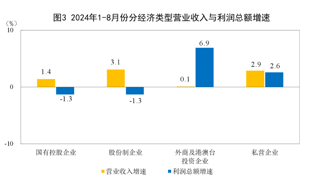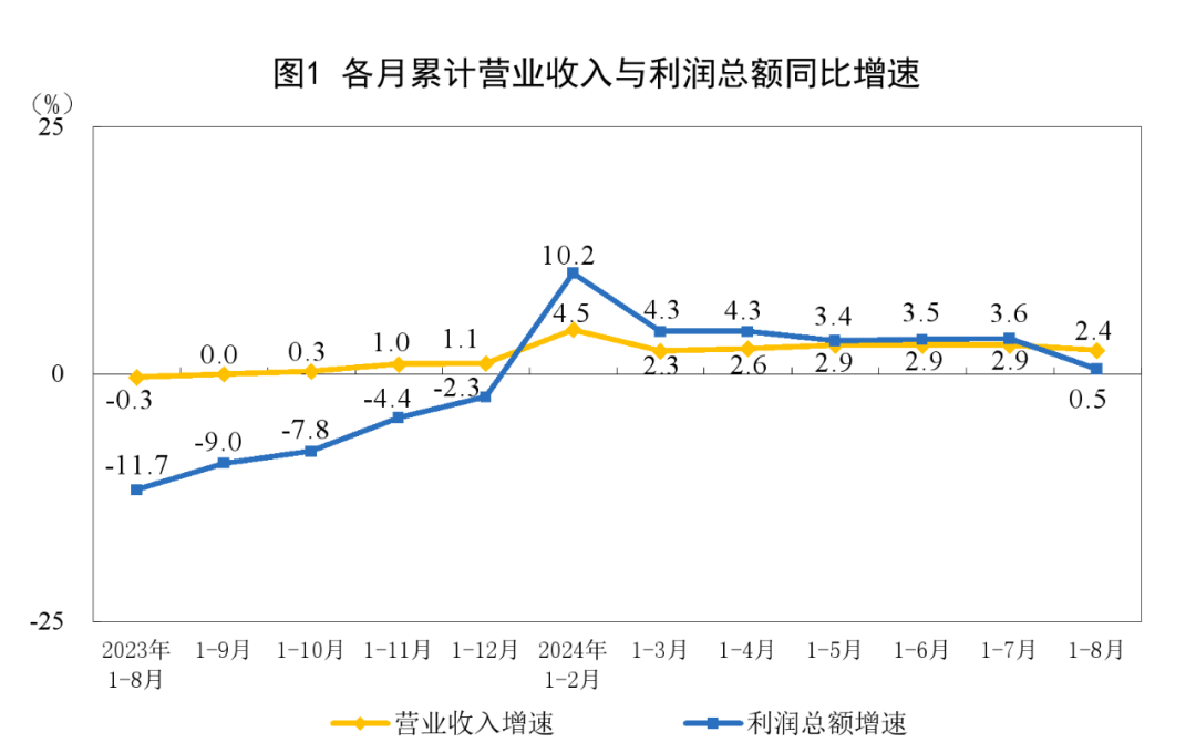1—8月份,全国规模以上工业企业实现利润总额46527.3亿元,同比增长0.5%(按可比口径计算,详见附注二)。1—8月份,规模以上工业企业中,国有控股企业实现利润总额15490.6亿元,同比下降1.3%;股份制企业实现利润总额34430.3亿元,下降1.3%;外商及港澳台投资企业实现利润总额11777.0亿元,增长6.9%;私营企业实现利润总额12648.3亿元,增长2.6%。1—8月份,采矿业实现利润总额8132.8亿元,同比下降9.2%;制造业实现利润总额32967.2亿元,增长1.1%;电力、热力、燃气及水生产和供应业实现利润总额5427.3亿元,增长14.7%。1—8月份,主要行业利润情况如下:有色金属冶炼和压延加工业利润同比增长64.2%,计算机、通信和其他电子设备制造业增长22.1%,农副食品加工业增长18.2%,电力、热力生产和供应业增长16.7%,纺织业增长14.7%,石油和天然气开采业增长3.9%,汽车制造业增长3.0%,通用设备制造业增长2.2%,化学原料和化学制品制造业增长0.6%,专用设备制造业下降6.0%,电气机械和器材制造业下降11.2%,煤炭开采和洗选业下降20.9%,非金属矿物制品业下降50.9%,石油煤炭及其他燃料加工业、黑色金属冶炼和压延加工业同比由盈转亏。1—8月份,规模以上工业企业实现营业收入87.10万亿元,同比增长2.4%;发生营业成本74.38万亿元,增长2.6%;营业收入利润率为5.34%,同比下降0.10个百分点。8月末,规模以上工业企业资产总计173.71万亿元,同比增长4.8%;负债合计100.11万亿元,增长4.6%;所有者权益合计73.60万亿元,增长5.2%;资产负债率为57.6%,同比下降0.2个百分点。8月末,规模以上工业企业应收账款25.50万亿元,同比增长8.4%;产成品存货6.53万亿元,增长5.1%。1—8月份,规模以上工业企业每百元营业收入中的成本为85.39元,同比增加0.19元;每百元营业收入中的费用为8.41元,同比增加0.04元。8月末,规模以上工业企业每百元资产实现的营业收入为76.5元,同比减少2.4元;人均营业收入为180.0万元,同比增加7.3万元;产成品存货周转天数为20.4天,同比增加0.3天;应收账款平均回收期为66.8天,同比增加3.7天。受去年同期高基数等因素影响,8月份,规模以上工业企业利润同比下降17.8%。