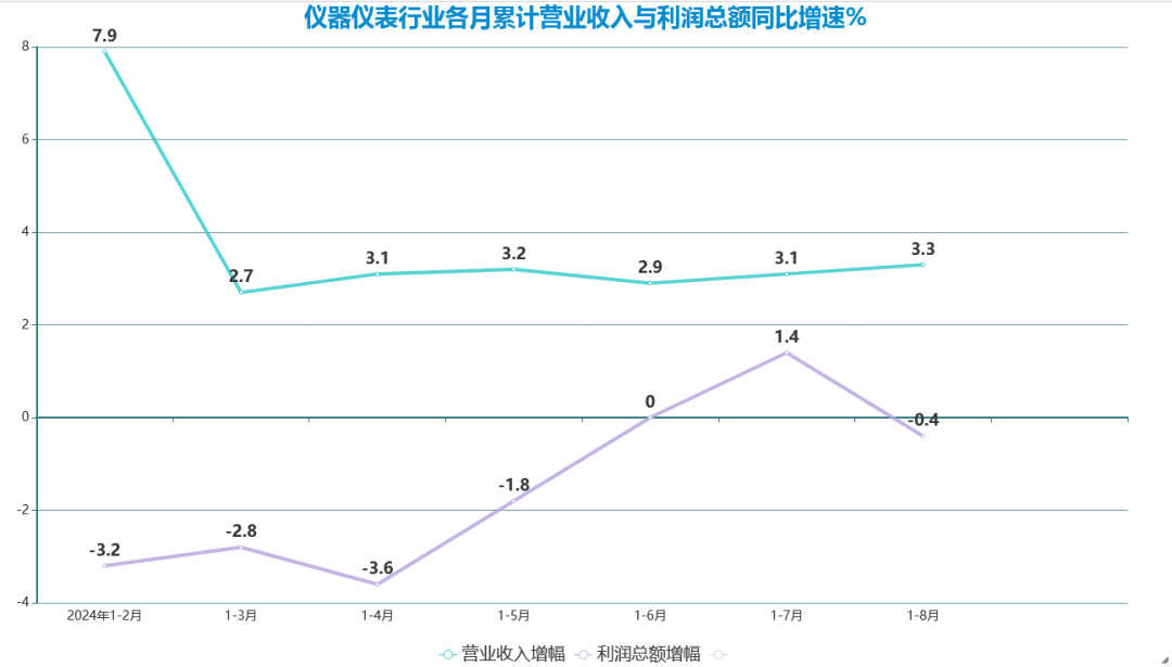 国家统计局发布最新数据,1—8月份,仪器仪表制造业营业收入6363.5亿元,同比增长3.3%,实现利润总额611.8亿元,同比增长-0.4%(1-7月利润总额同比增幅为1.4%)。